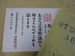 12月に3年生から6年生の書き初め指導をしていただいた戸沼先生に名前や番号を書いていただいた卒業証書。