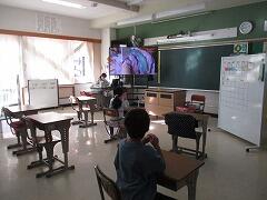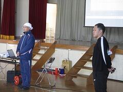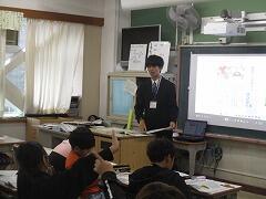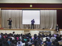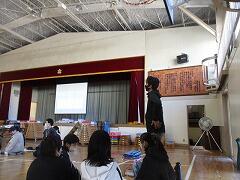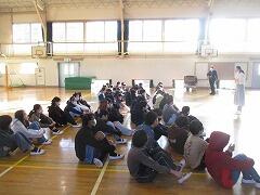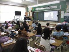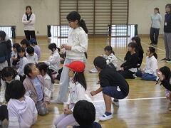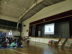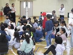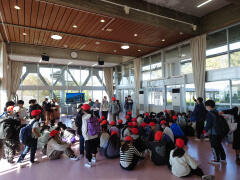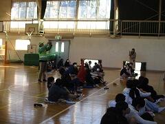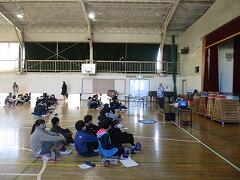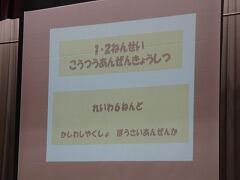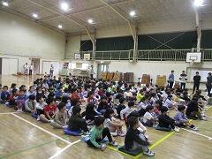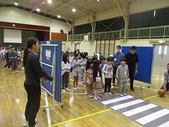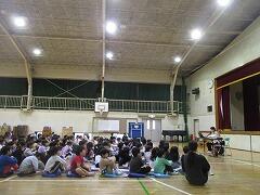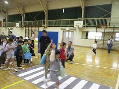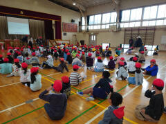 全学年対象で、交通安全教室を行いました。1・2年生、3・4年生、5・6年生で1時間ずつ体育館で実施しました。(写真は1・2年生の部です。)