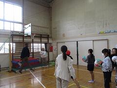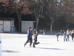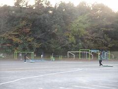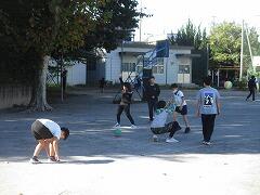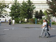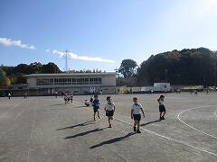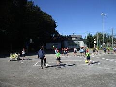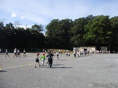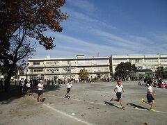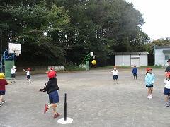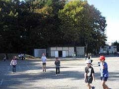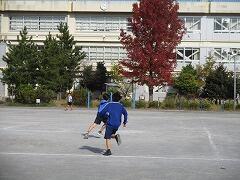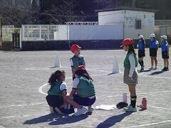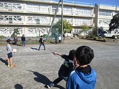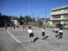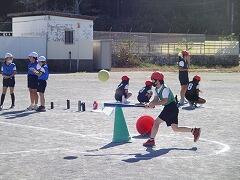 風吹く中、3年生と2年生がそれぞれ「ベースボール型」のスポーツと「ゴール型」のスポーツを体育で行っていました。