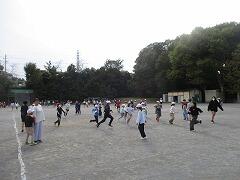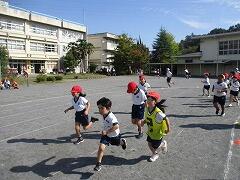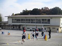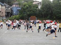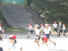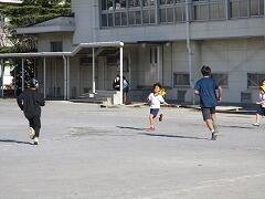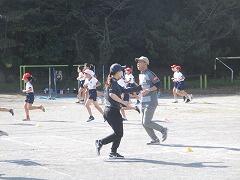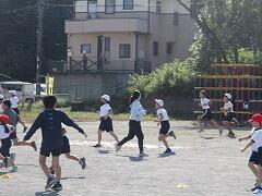 先生方は、子どもと一緒に走ったり、子どもの様子を見ながら逆回りして走ったりしています。