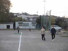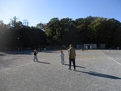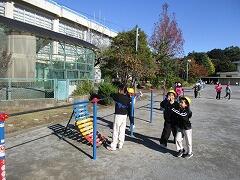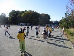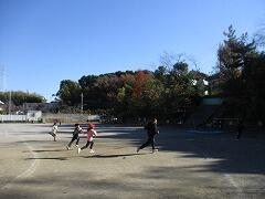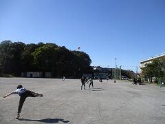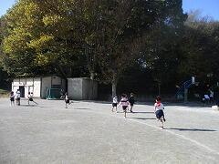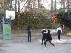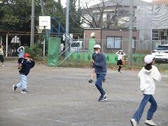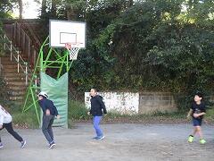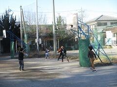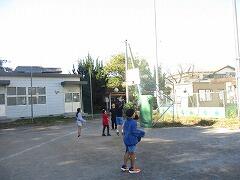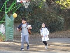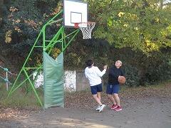 日影のコートでバスケットで交流する子どもたち。寒くないかな。遊具はそのうち握れないほどキンキンに冷えますが、まだ大丈夫です。