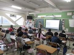 国語の勉強です。質問の内容は子どもらしく、実はその時、校長室に来客があったのですが、「子どもの活動は良いねえ。温かい雰囲気だねえ。」とニコニコしておられました。学校のあちこちで、先生方へのインタビューが行われます。