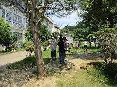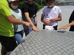 数十人の児童が外に出てきて、日なたの気温を感じたり、日陰の状態を感じたり、腕をぬらしてみたり、朝礼台の熱さを感じてみたりしていました。