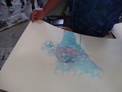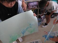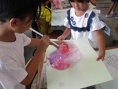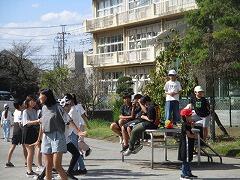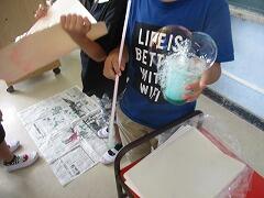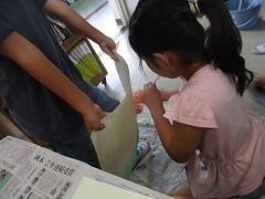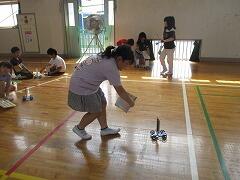 3年生が風で動く車を一生懸命に仰いで動かしていました。