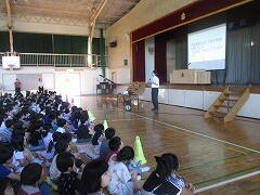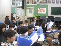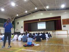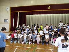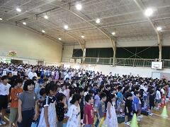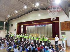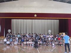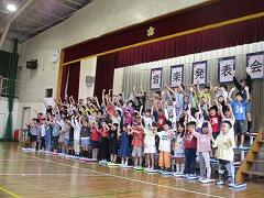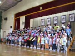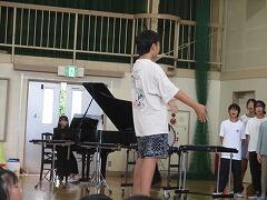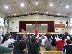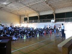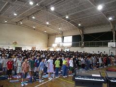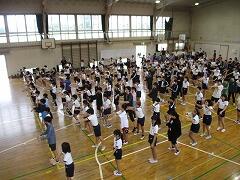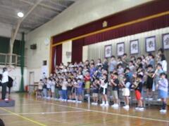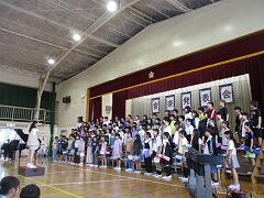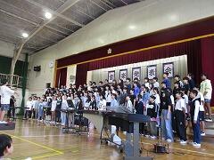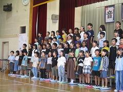 最初の全校合唱で喉の準備体操。子どもたちの良い歌声が体育館に響きました。