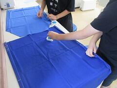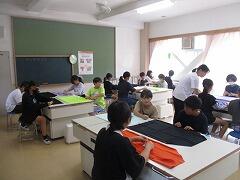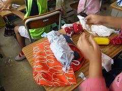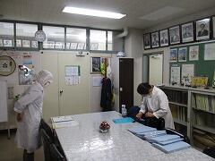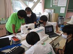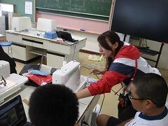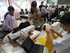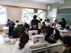 家庭科室では5年生のエプロンづくり。丸つけ隊で来てくださっていたお二人の地域の方のお力も借りました。