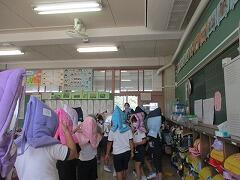 このじめじめ感は着ているものの調節ではどうしようもありません。できることといったら、水分補給と汗ふきです。汗がふけるハンカチや小さめのタオルは毎日持たせてください。