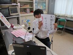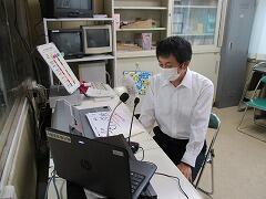 放送室の放送機械とパソコンを使って各教室に音声と映像を流す形で行いました。