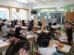 6年生も教科によって担任を交換する教科担任制を取り入れています。いろいろな先生が関わる中で、学年の子どもたちを知り、より良い学びにつなげていきたいという考えのもとでの取り組みです。