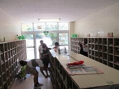 曇り空のもと、今日も子どもたちが元気に登校してきました。朝から委員会の仕事もがんばっています。