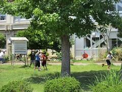 数十人の児童が外に出てきて、日なたの気温を感じたり、日陰の状態を感じたり、腕をぬらしてみたり、朝礼台の熱さを感じてみたりしていました。