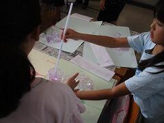 用意されたいくつかの色の石けん水をつかってあわを作り、それを画用紙にのせていきます。とても楽しそうな活動で、2クラスとも教室のあちこちから明るいうれしそうな声が聞こえていました。