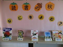 図書室廊下、季節にあった良い掲示物です。「○○の秋」というような言葉とともに本も展示してあります。