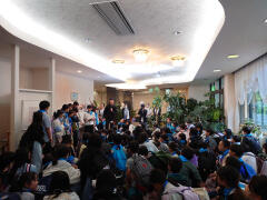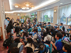 小雨がぱらついていたので、ホテルのロビーで入所式をしました。ホテルのみなさんに温かく迎えていただきました。