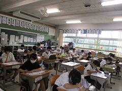 曇り空のもと、今日も子どもたちが元気に登校してきました。朝から委員会の仕事もがんばっています。