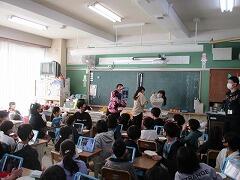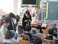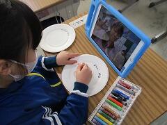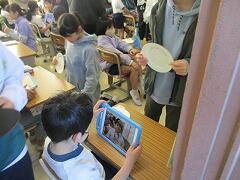 で、タブレット活用です。6年生がマスクを取った一瞬を狙って、1年生が写真を撮り、その表情を本人に確認してもらって、この場はおしまいです。この場で絵は描きません。