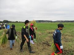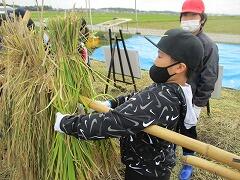 5年生が社会科の「米づくり」の学習がらみでの稲刈り体験を行いました。