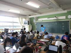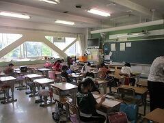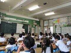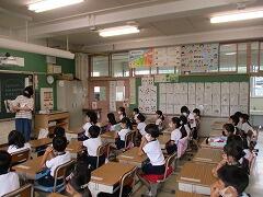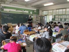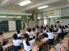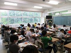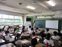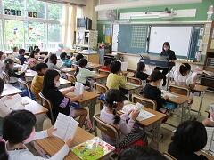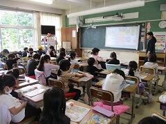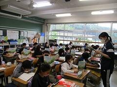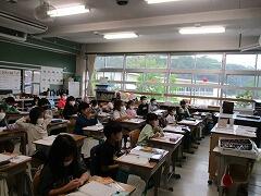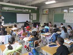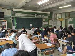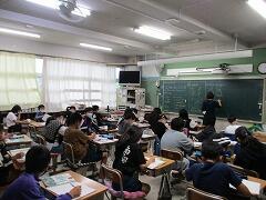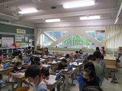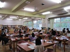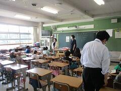 1つの授業を皆で参観し、「話し方」「問いかけ方」「活動のさせ方」などなど場面場面で学ぶべきことはたくさんあります。例え担当学年は違ったとしても、明日の自分の授業に生かすことはできます。こういう形の研修を年に数回行いますが、その際、該当クラス以外は自習となります。