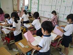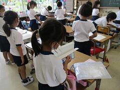 お絵かきをしたり、学級にあるカードで遊んだり、折り紙をしたり・・・。だれかと一緒に過ごしている子が多いようです。