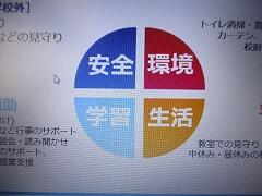 話し合いのきっかけとなればということで学校からの提案としては、「下校時刻に合わせたお散歩(安全)」「敷地脇の坂道のフェンスあたりの草の処理(環境)」「プリント類などの丸付け(学習)」「休み時間の見守り(生活)」などをあげさせてもらいました。