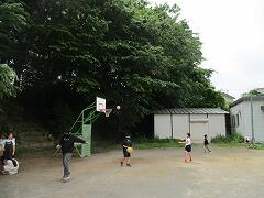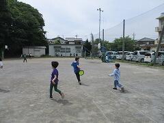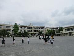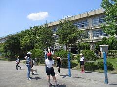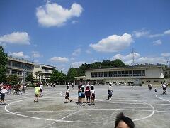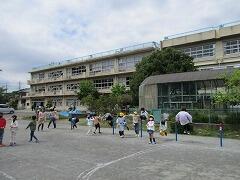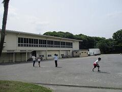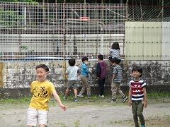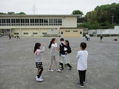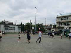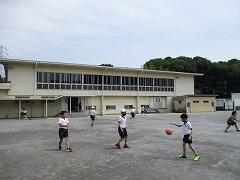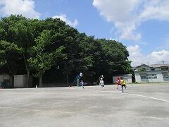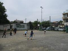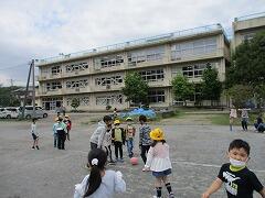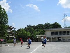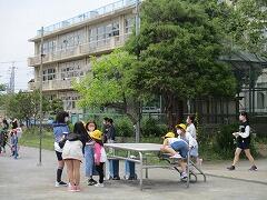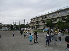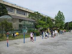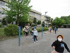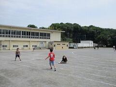 2時間後の業間休みには曇り空の下で子どもたちが元気に外に出て遊んでいました。