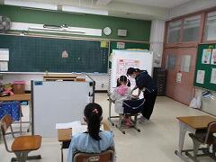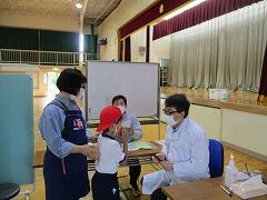 養護教諭の原田先生が1年生にやり方の説明をして、教室の後ろで順番に検査です。