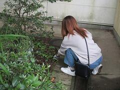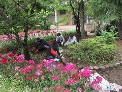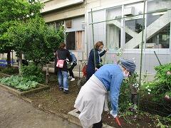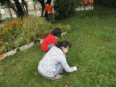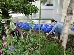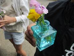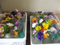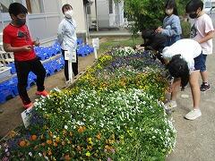 栽培委員会の子どもたちが、花壇で育った花を小さな小瓶に移しています。