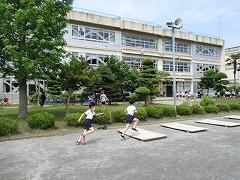 業間休みには、リレーの練習をしています。トラックでは3・4年生。