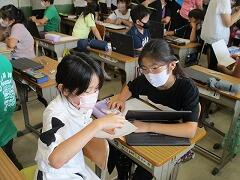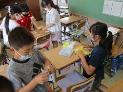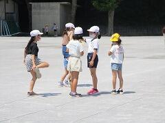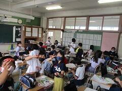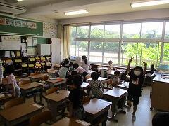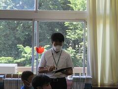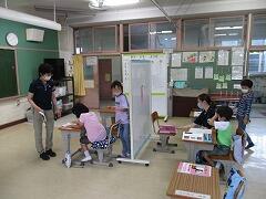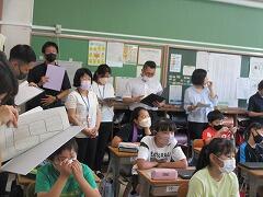 業間休みに入ったタイミングで「熱中症の心配があるので、室内、室外どちらで過ごすにしても水分を補給してください。外に出て暑さを感じたときにマスクを外して構いません。遊び終わった後は、顔や腕を水で洗い体を冷やしましょう。自分の命は自分で守りましょう。」という放送を流しました。