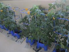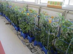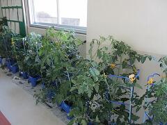 大きく育った2年生の鉢植えが風で倒れてしまうので、廊下に避難させました。倒れるたびに、せっかく成長しているミニトマトが落ちてしまうのは悲しすぎます。これで、もう安心。