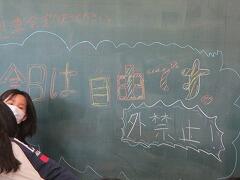 校舎内の換気をする関係で、あちこちの窓が開いています。廊下の窓から温風、教室の窓からも温風が入ってきます。外で日差しを浴びているほどではありませんが、廊下もなかなかの暖かさです。それに伴ってたくさんの子どもたちがいる教室も思ったようには冷えません。