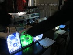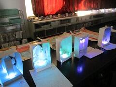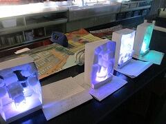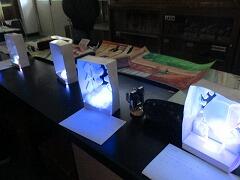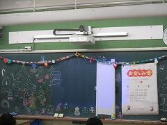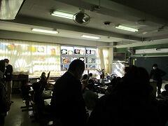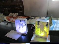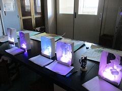 (上の記事中の写真は、6年4組の図工の作品の一部で、暗くした理科室で鑑賞しているところを撮ったものです。とてもきれいでした。)