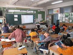 5年生は2クラスそれぞれの教室をリモートでつなげて、合同のレクをしていました。