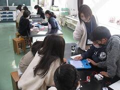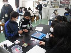 今日は6年生が理科の授業でMESHを使って「暗くなったら電気をつける。明るくなったら電気を消す。」という命令が回路に反応するためのプログラムの勉強をしていました。
