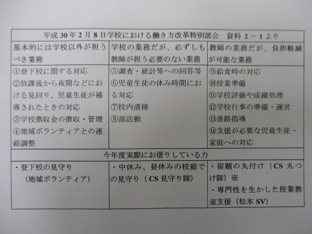 本校では、文科省からかつて出された働き方改革についての資料をもとに、今年度、地域の方に手伝っていただけることをいくつかお願いしてきました。下がそれです。