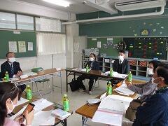 まずは、今年度の会長である西條様からご挨拶をいただきました。それから、学校評価の結果について、学校から補足しながら説明をしていきました。