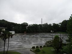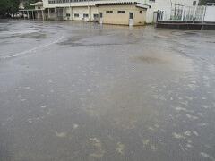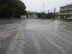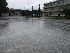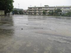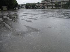 朝の校庭の様子です。雨は降り続いています。
