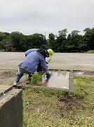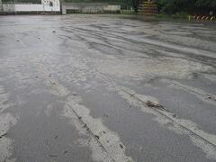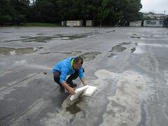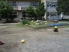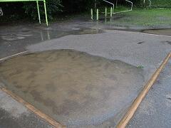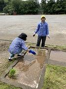 予報より早めに雨も上がり、空も明るくなり、太陽も顔を出し、好条件の中、職員や保護者の皆さんのお力をお借りして、あんなにあった水たまりがみるみる無くなっていきました。