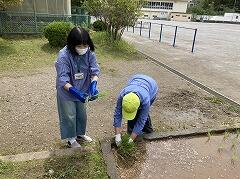 学校運営協議会委員の篠田さん(ふる協会長)・小野寺さん(地域協働活動推進委員)・入道さん(民生主任児童委員)や見守り隊のみなさんが岩石園の整備に集まってくださいました。