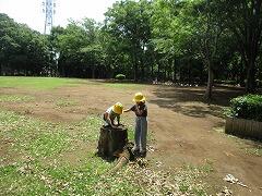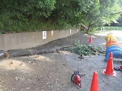 体育発表会の前日作業中に、活動に支障の無い状態までチェーンソーで切れるところまで職員が切って、プール横に運びました。