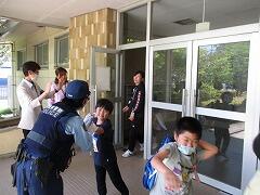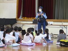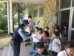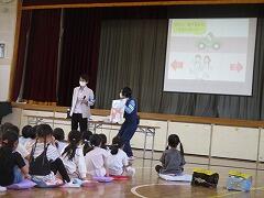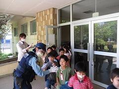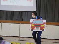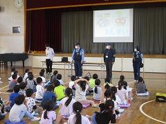 昨日、柏警察署から、生活安全課の子どもセーフティキーパーの方と移動交番担当の方々をお招きして、1年生対象に防犯教室を行いました。
