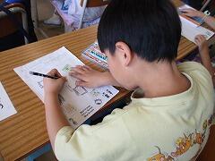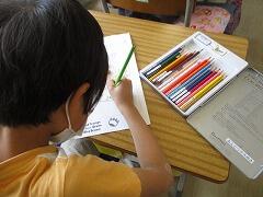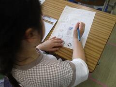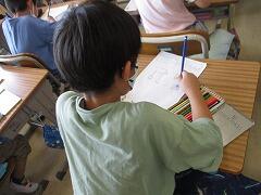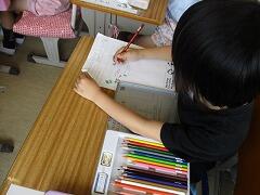 1年生が学校探検後に振り返りをしています。字を書いたり絵を書いたりしています。