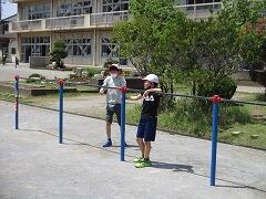 今日は合同練習で、全校児童が椅子を持って外に出ます。椅子を置く場所を示すために必要な作業をしてくれました。