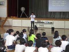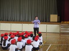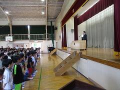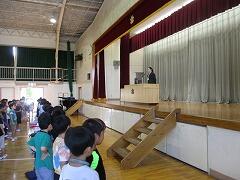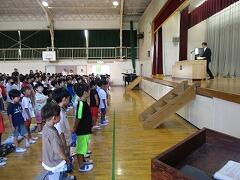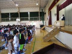 「おはようございます」と子どもたちとの元気なあいさつから始まった始業式の校長の話。