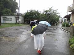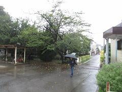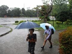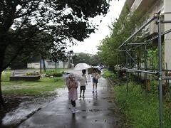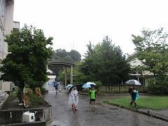 雨の中、子どもたちが登校してきました。