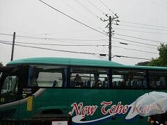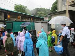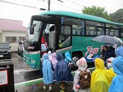 あいにくの雨で、晴れているときより乗り降りに時間がかかります。今日は、市のスクールバス利用規程に従い、4クラスで6台に分かれて、乗り込みました。