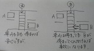 しかしながら、下の図のように、こちら側とあちら側の車が、止まらないと、横断歩道上でも事故は起こります。歩行者も油断はできません。