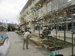 用務員の松橋さんが下に落ちた木蓮の花びらを掃き集めてくださっていました。