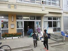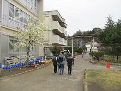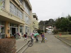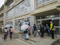 「校長先生、さようなら」と明るく手を振って帰る子どもたち。曇り空のもとでも子どもたちは元気です。「車に気をつけて帰るんだよ」「はーい」というやりとりもほっこりするひとときです。