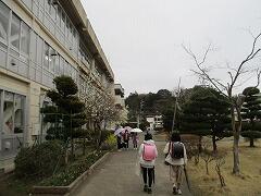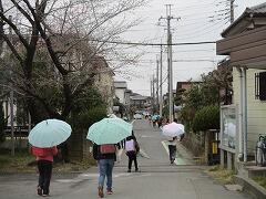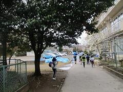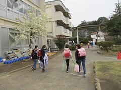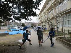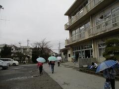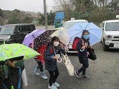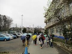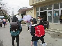 学年の終わりが近づいてきて、持ち帰る物も少しずつ増えています。重そうに帰る児童もいます。雨がポツポツ降り始めた時間だったので、傘をさしている子とさしていない子がいます。